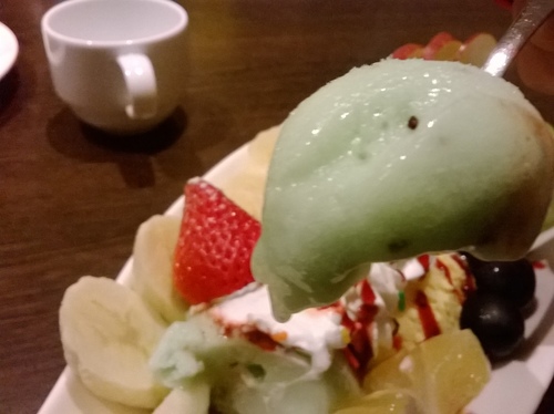 三球冰淇淋一起端上來,五分鐘之後,芒果、青蘋果稍微溶化,草莓卻已經攤成水了