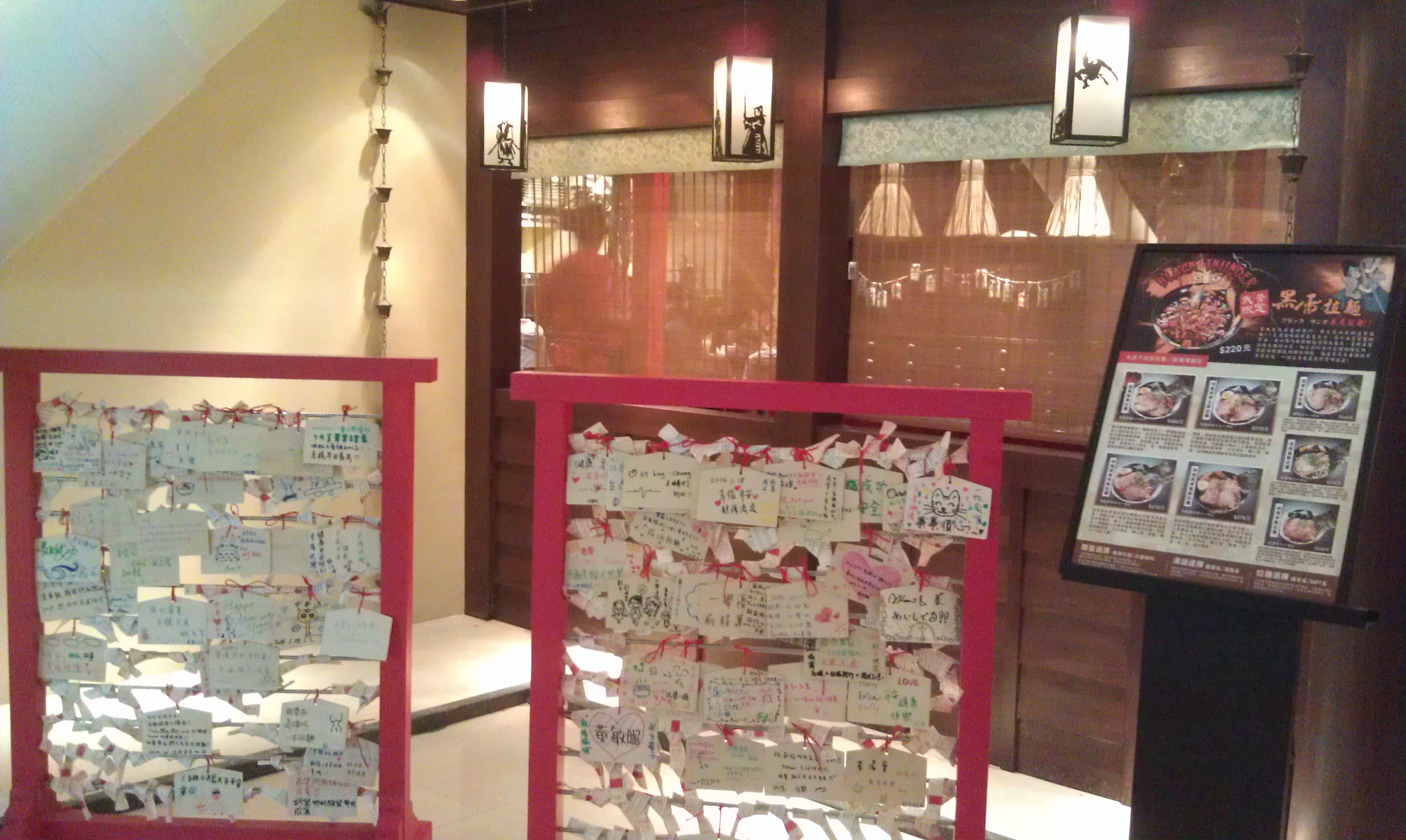 店門旁擺著日本神社的祈福牌坊,上頭掛著客人許下的願望