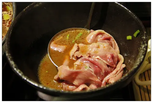 寬巷子的招牌食材之一:玫瑰花松阪豬!嫩粉紅肉質與油花相間的松阪豬肉片,在店家的巧手之下,幻化成小池塘邊的粉紅玫瑰,而洋蔥挖空裝盛蛋液的池塘縮影,還有一項特別的功能,就是下鍋涮肉之前,可將松阪豬沾裹蛋白,口感會更滑順,真是實用又美觀的裝飾藝術!