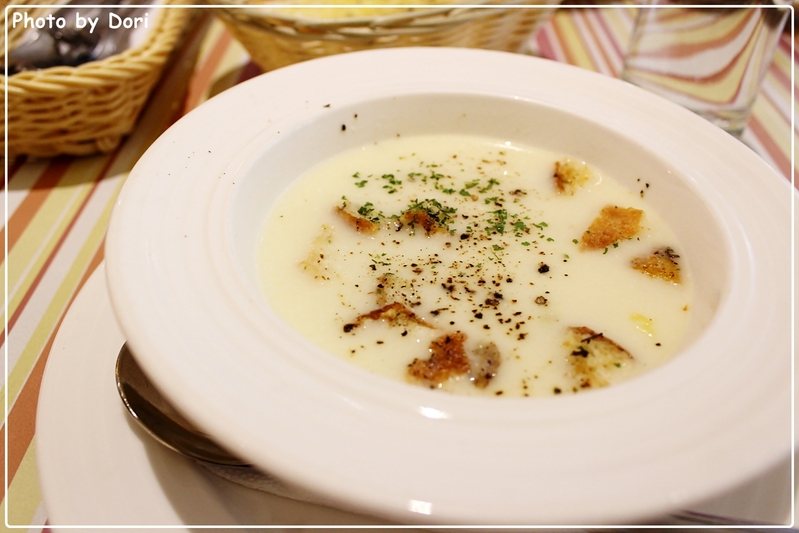 每日例湯為巧達蘑菇湯,濃稠度好似偏稀了些,但味道並未因此轉淡,上頭除了有黑胡椒顆粒、海苔之外,還加入了濃湯中都會使用到的方型烤麵包,用料還算大方。