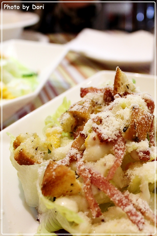 凱薩沙拉用料豐富,除了生菜葉、方形吐司磚之外,烘烤過的培根及灑上的起士粉都是增添香氣的不二法門,我只能說這盤沙拉霸氣的贏過了千島沙拉。