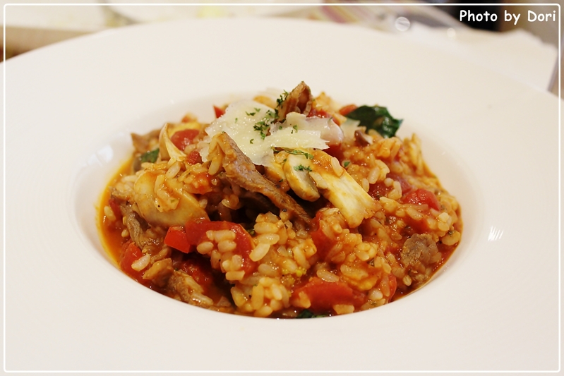 而這裡的燉飯雖然並不是選用西班牙米飯,但每一口都吃的到入味的紅色番茄香氣,軟嫩的牛肉也有其厚薄度,再搭配上清爽的白蘑菇、削上的起士,更是讓價值度提升不少,基本上都有在一定的水準範圍內,還算不錯。