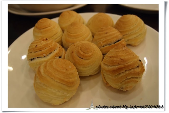 外層就像港式酥餅一圈圈地堆疊 一口咬下油油酥酥 原以為是豆沙餡 沒想到卻是濃濃芝麻味