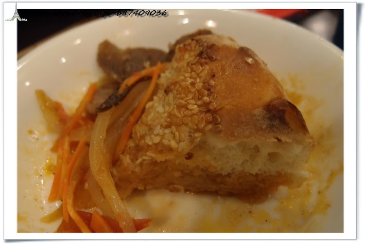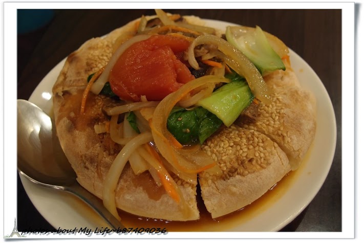 表層烤的乾硬所以芝麻香多 中間吸附湯汁後變的溼軟卻還有點咬勁 咬著會有不同口感 超妙