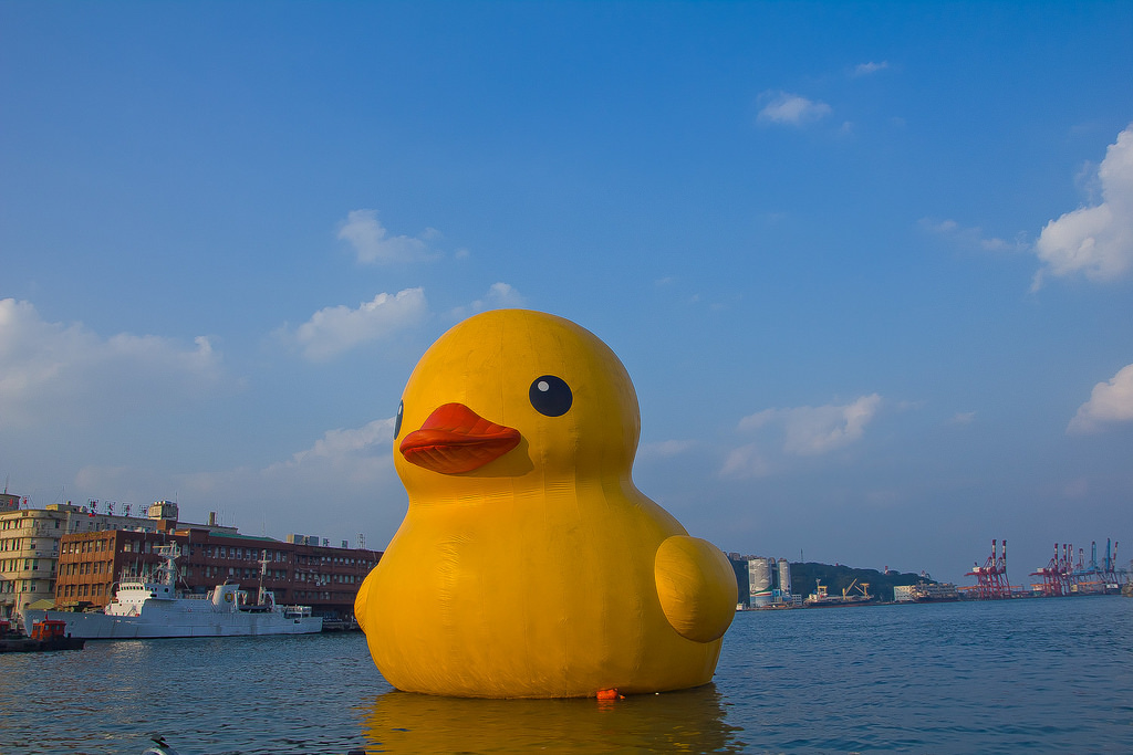 有著藍天白雲當背景,更襯托出小鴨的耀眼