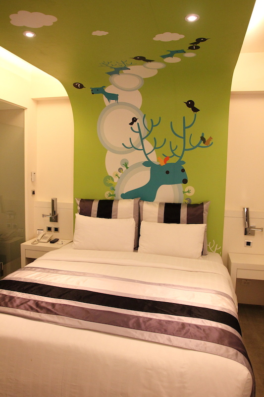 而我今日住的則是六樓的和平綠,大床後方的裝飾是綠色牆面加上可愛的彩繪鹿圖案,這間房間好有童趣呀。