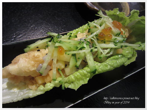 生菜就像一條小舟,上層還有鮭魚卵與黃瓜絲