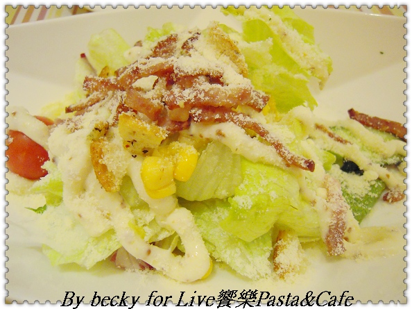 我點的是凱薩田園沙拉,朋友點的是和風;凱薩沙拉:生菜很新鮮脆嫰,上面灑著許多起士粉,除了生菜外,還有麵包塊、培根條、玉米粒、蕃茄等,除了起士粉及培根的鹹味襯托出生菜的甜味,還有香氣混合一起,在嘴中交織成各種好滋味;和風口感:很清淡的油醋醬汁,略帶些微酸感,生菜上加些堅果類,吃起來脆脆又帶些清爽。