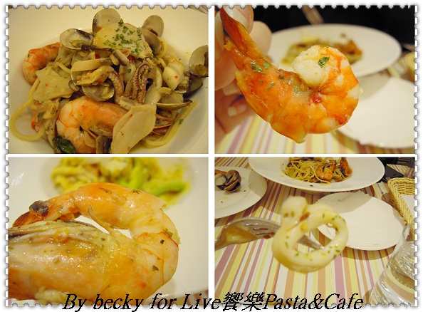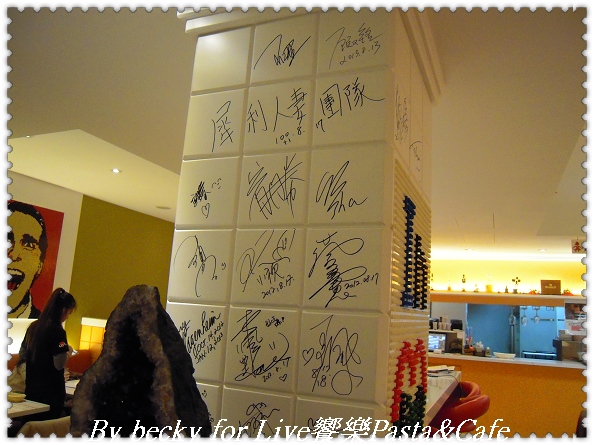 今天到Live饗樂Pasta&Café,不但吃到好吃的義大利麵,且也看到許多藝人的簽名,店家的服務也很好,三不五時就會來添加茶水,且也很細心解說,餐點部份也很合我們的口味,所以跟與朋友聚餐吃飯,倒是一個好選擇,最後要離開時店長還說,他們延長了營業時間,方便讓客人可以久坐閒聊,真是很貼心。