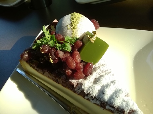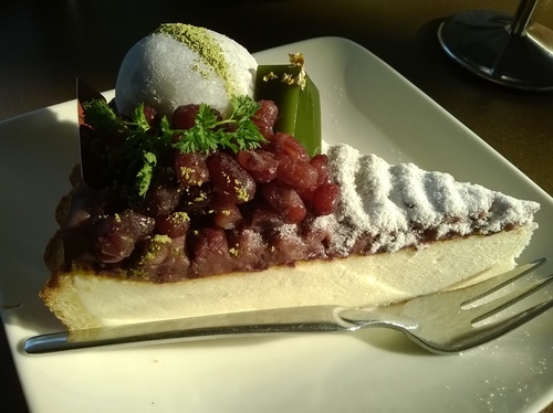 共有四個層次,底部是派皮,中間是主要的派餡,其上鋪了一層厚厚的紅豆泥,再放上豐富、大量的蜜紅豆,並以大福皮、抹茶凍綴飾