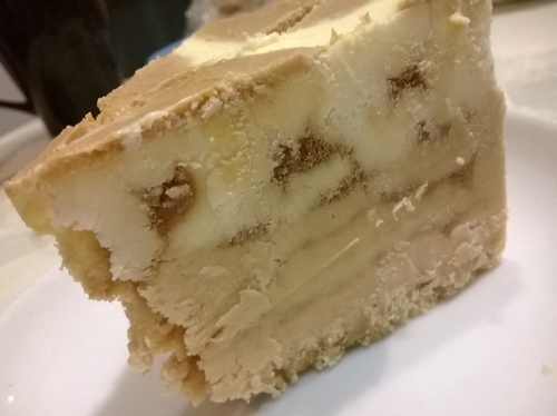 主要分成了三層:上面是原味乳酪拌入略苦的焦糖緞帶,中間的部分則是把焦糖整個融入乳酪之中,帶有焦糖特有的苦味,所以才需要上面的掩蔽,冰涼焦糖緞帶在乳酪融化後會像蛇一樣突然竄出