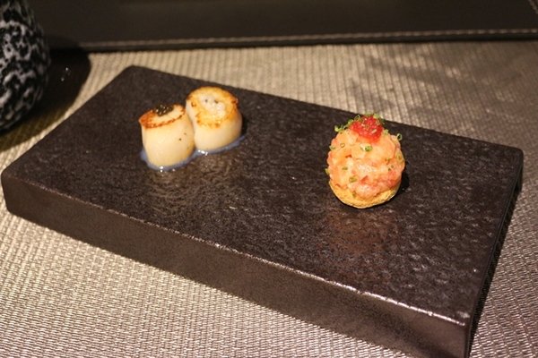 Tapis開胃小品- 鮭魚塔塔佐鯡魚卵、干煎干貝。