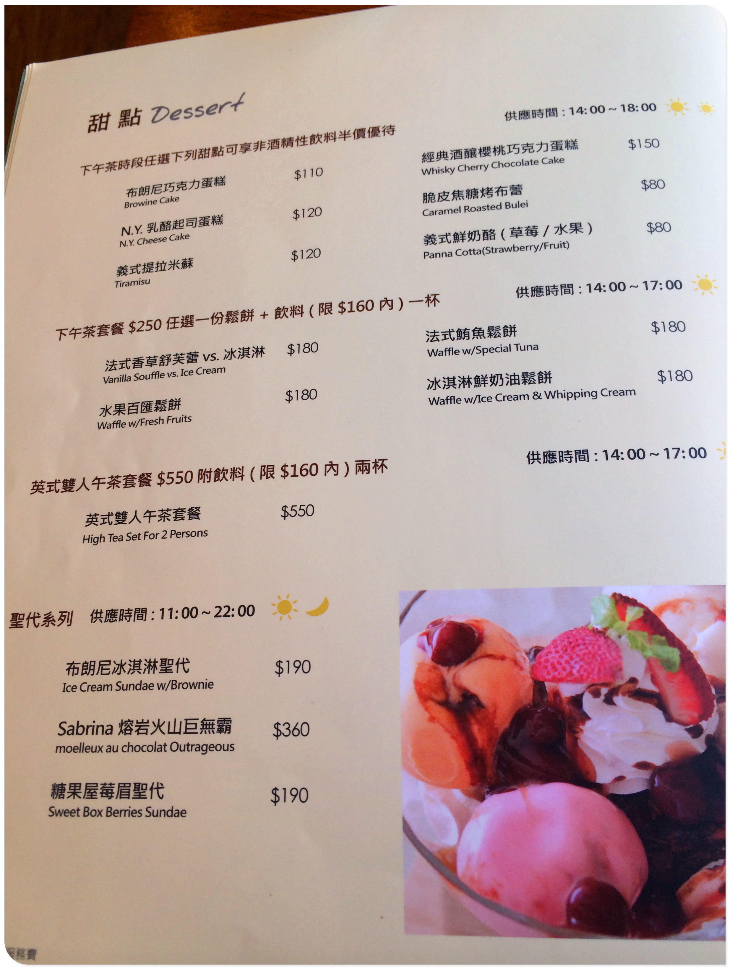 翻開菜單,裡面餐點樣式相當豐富,早午餐、三明治、義式料理、甜點、飲料等等等....
