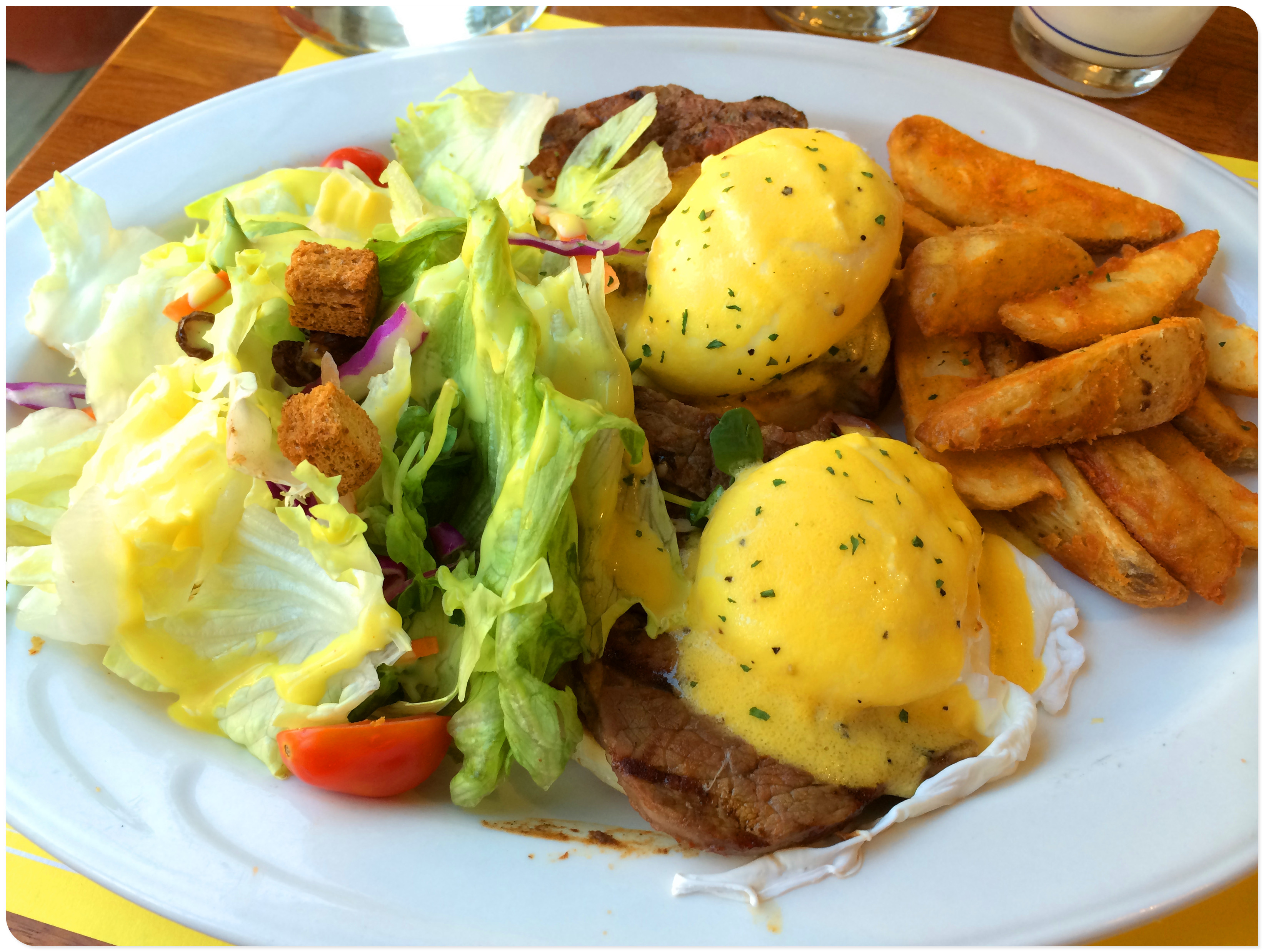 兩片烤牛肉、兩顆班尼迪克蛋,還有現炸薯條和生菜沙拉