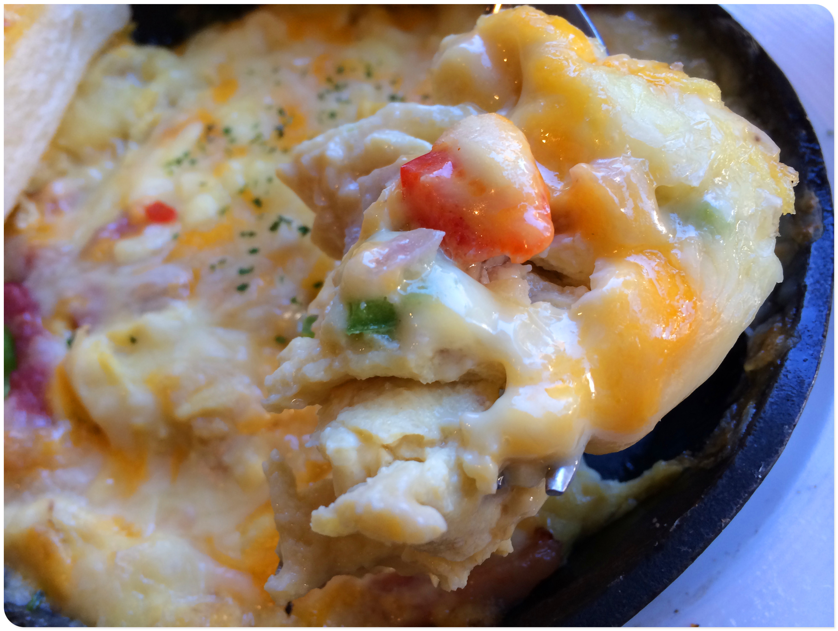 鐵鍋香煎培根,加入紅甜椒及青椒洋蔥等拌炒,上面還有滿滿的起士