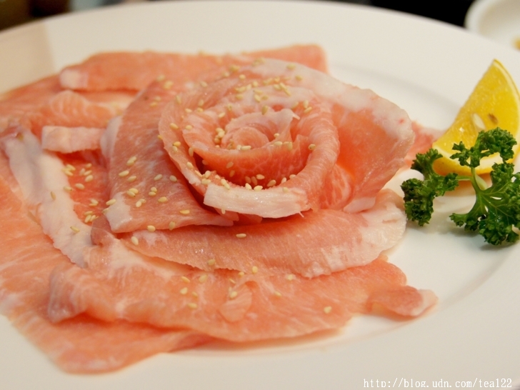 網路上看過好多次,一直心癢難耐的極上松阪豬肉玫瑰送來了,我心花怒放,拿起相機就對著它開拍了,這剛從冷凍櫃端出來的松阪玫瑰花,不搶快,一退冰造型就垮了。美國RIVER自然牛小排、水梨醃醬牛小排、厚切豬五花依序上菜,肉質的新鮮度一眼看穿,肉片厚度適中,淋上獨門配方醬汁,依個人喜好的熟度烘烤,搭上生菜,一級美味。