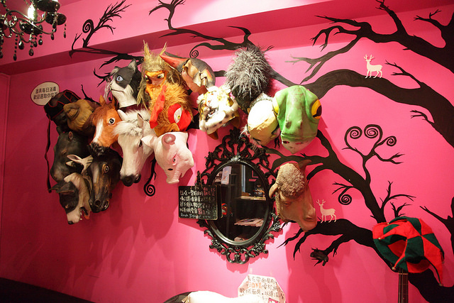 點完餐之後,馬上到入口的動物面具牆報到!來這裡一定要來戴面具玩