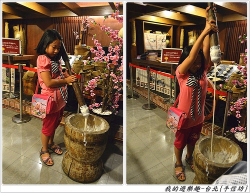 呢 ~ 在一旁的搗麻糬是可以動手體驗的,老婆先來小試身手 .....