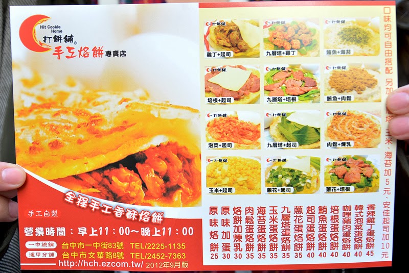 | 打餅舖手工烙餅在一中街開店時間已有十幾年,口味林林種種多達15種以上, 還不定時的研發出新口味,小小一塊圓餅卻能有如此多種變化, 一天吃一種也吃不完。 |