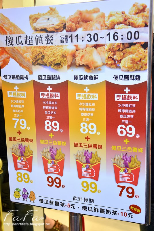 | 11:30~16:00的傻瓜超值餐,價格上的確很划算, 本想要試試傻瓜蔬脆雞排+手搖飲料+傻瓜三色薯條=NT$89, 可惜過了時間。 |