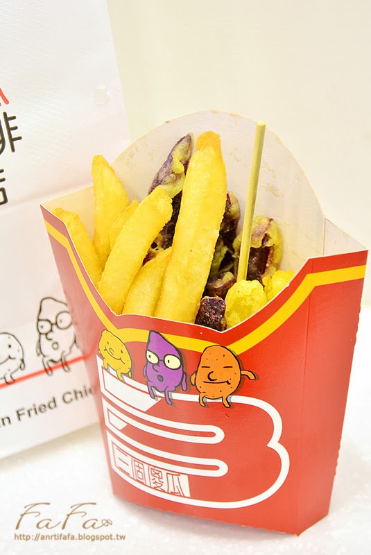 | 傻瓜三色薯條NT$39薯條排列的順序剛好跟紙盒上的公仔一模一樣, 馬鈴薯、紫番薯、金黃番薯。 |