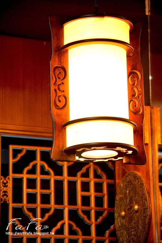 | 燈飾的古色古香與旁邊中國風雕花木製隔板很契合。 |
