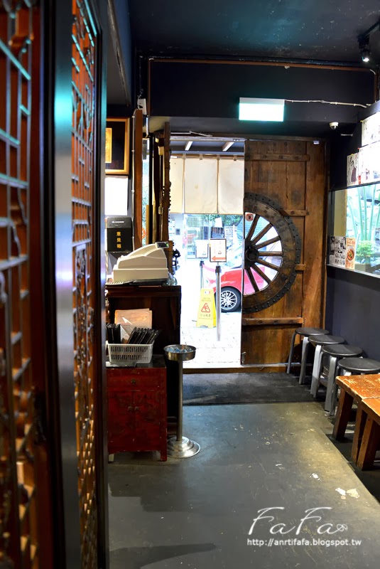 | 門口使用的重木門造型特別有古代風情, 不過門上的推字就顯得格格不入了些,而且還有兩個。 |