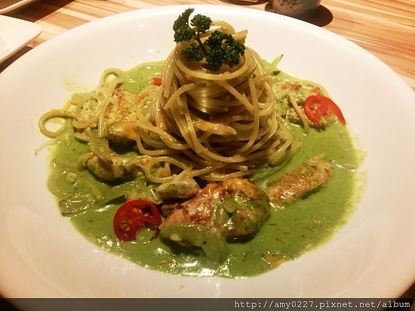 這道義大利麵看起來的賣相相當不錯,嫩綠色的醬汁搭配點點鮮紅的小番茄片點綴,讓人看了就食指大動