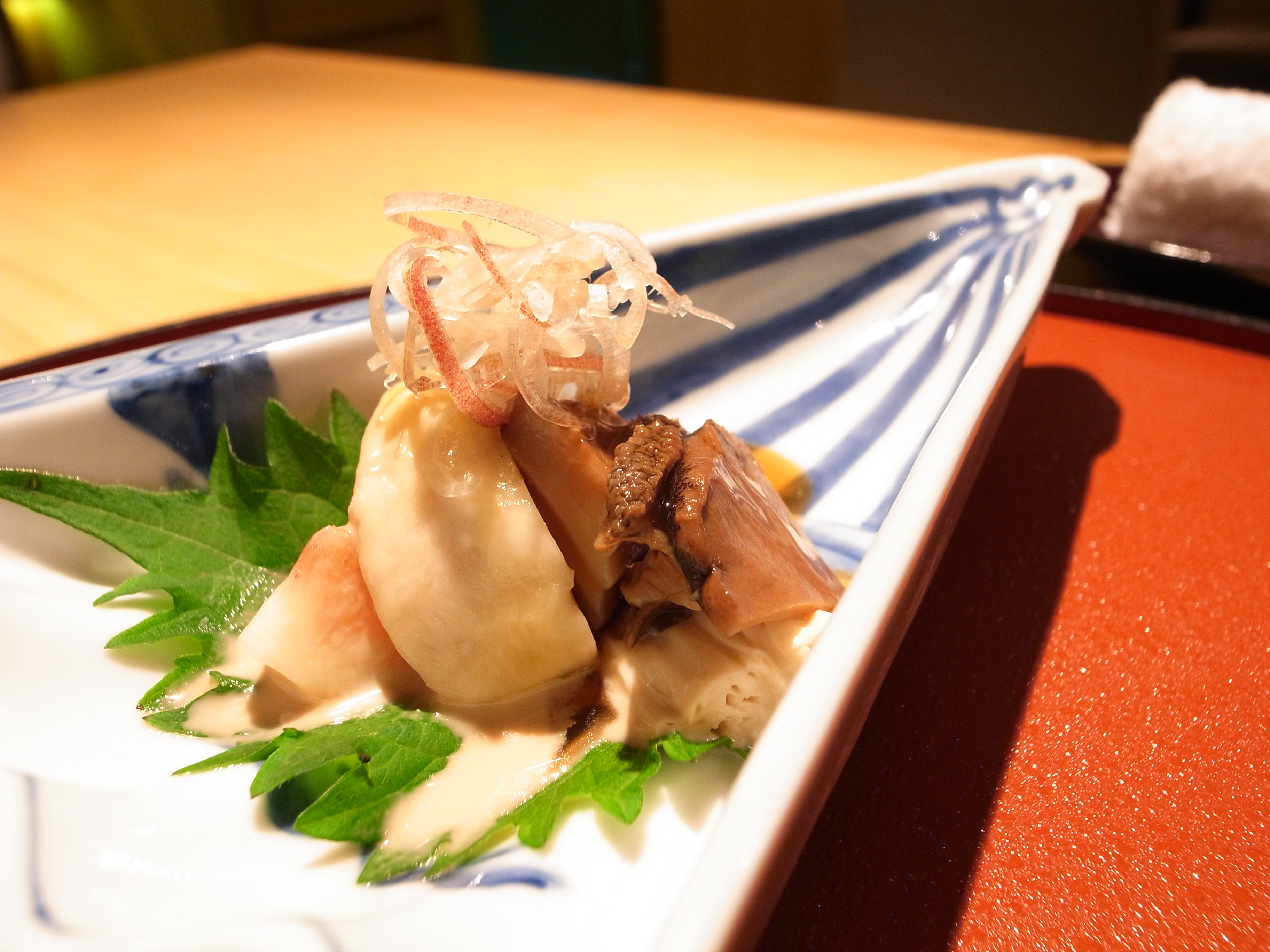 首先是鮑魚無花果佐京都腐皮茗荷與北海道秋刀魚甘露煮兩道前付,