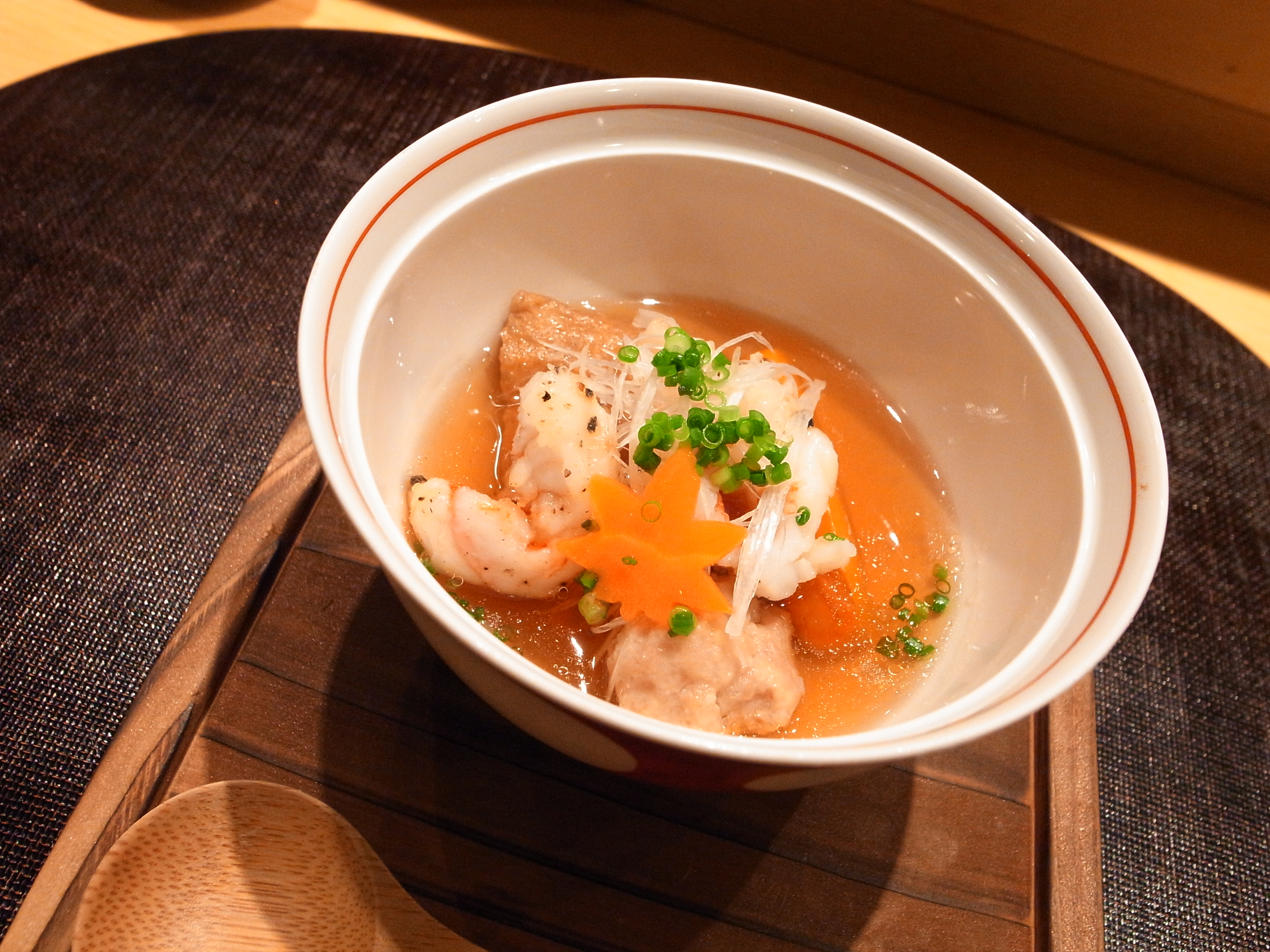 手工雞肉丸子佐野生明蝦,大和芋佐八方醋與赤鯥魚大葉燒,
