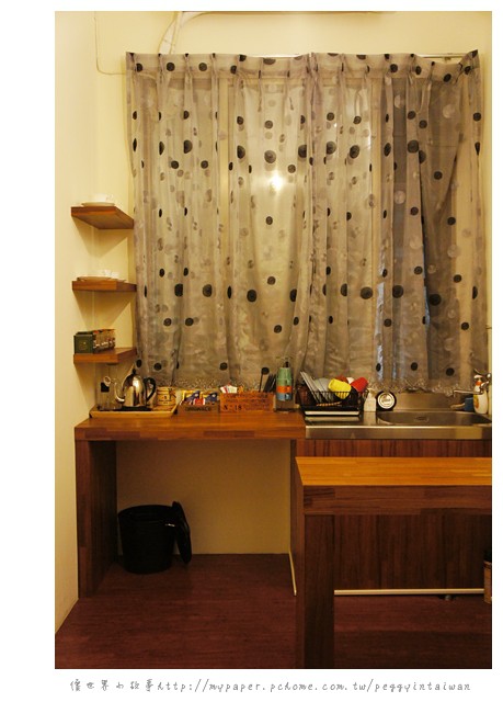 老房子許多都是狹長格局,走進大門後,左手邊是簡單的廚房吧台區,沒有瓦斯爐,台南小吃那麼多,旅人們可以在外面吃飽喝足後,再進入民宿歇息,吧台區有咖啡、茶包或茶葉,想像著與三五好友,晚上大家在這裡來杯熱茶或熱咖啡暢談的畫面,很有自己家的FU!