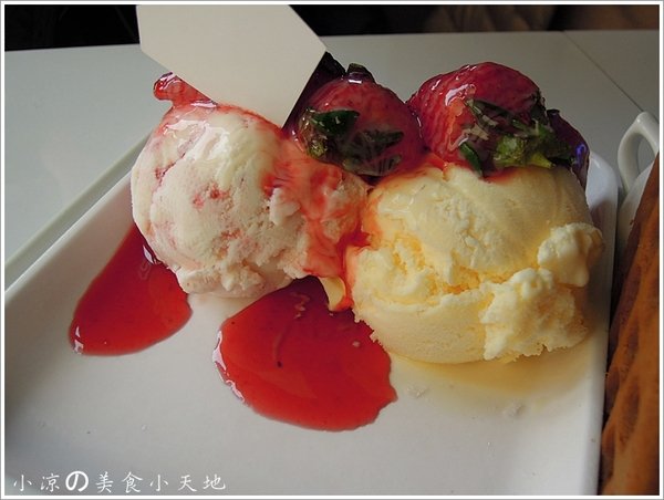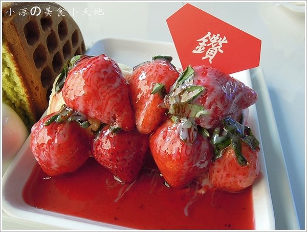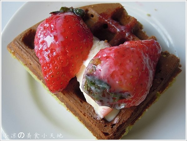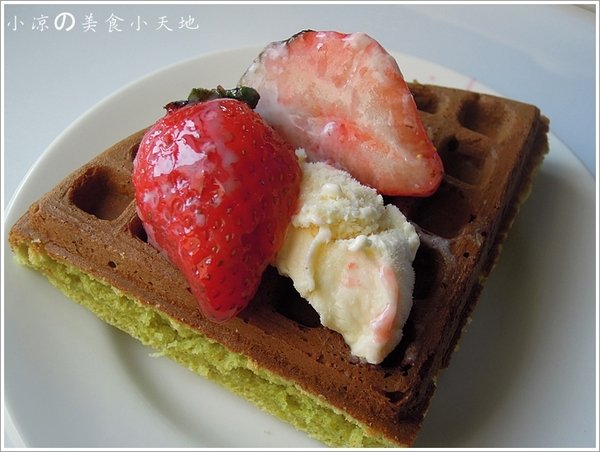 抹茶鬆餅口感外酥內軟,搭配上草莓冰淇淋,還有那大到不行的酸甜草莓