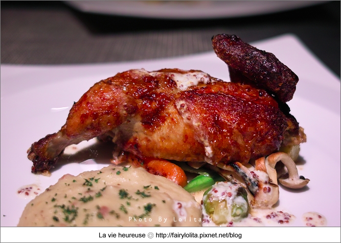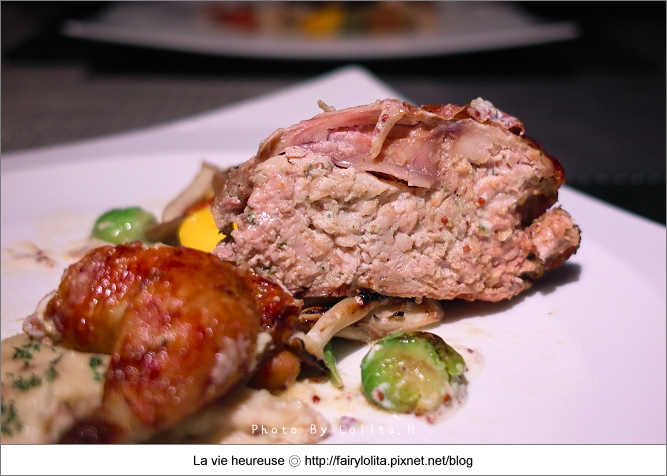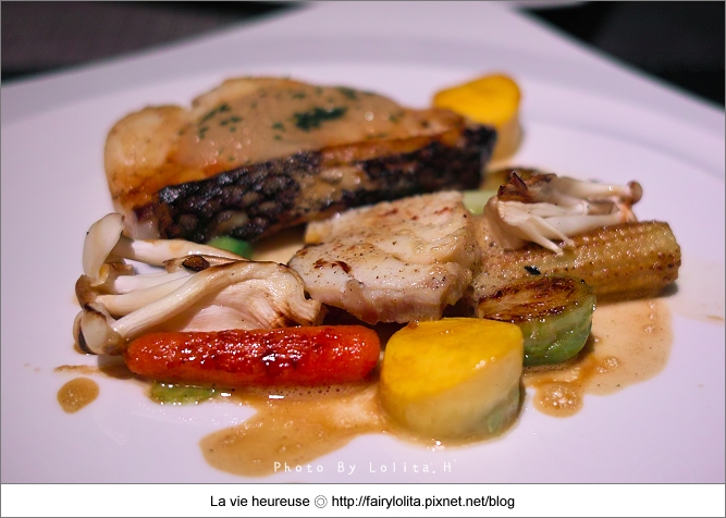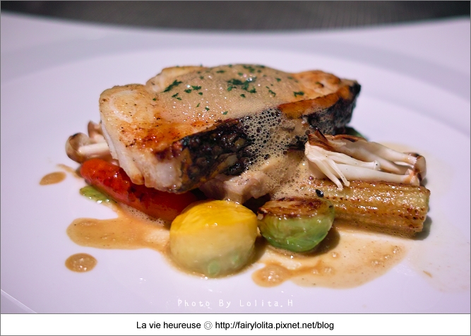 魚肉細緻紮實,油脂豐脥而不膩,讓不喜魚肉的我都忍不住吃了好幾口,尤其上頭用龍蝦做成的泡泡醬汁更是叫人驚豔,完美地帶出魚肉甜味,卻也巧妙表現龍蝦原本的自然海味,不過這道菜建議熟的時盡快品嚐,冷掉之後就會慢慢有腥味跑出來囉!