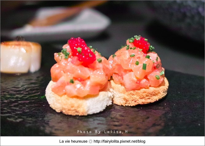 個頭小小,一口一個剛剛好,底下舖了鬆脆的餅乾土司,上頭則堆疊了切丁入味的鮭魚肉塊,再佐以鯡魚卵提味裝飾,模樣看起來很是精緻,一口咬下,滿嘴即充滿飽滿的新鮮海洋味,入口即化幾乎不需什麼咀嚼,其中還帶有一股美奶滋淡淡的甜香氣。