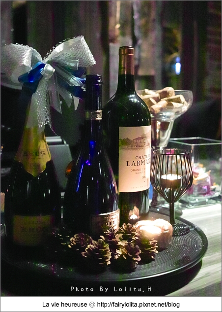 因裡面燈光實在太暗了,我的相機整個不是很夠力,只好選一處感覺比較明亮的地方,拍張酒窖收藏的酒品,別看只有這一小區,但酒類多到另人乍舌的地步呢!各式各樣的酒瓶相間排列,形成一道寬廣的酒牆,從葡萄酒、香檳、紅酒、白酒,及義大利、西班牙等等各式酒款,不僅僅是裝潢而已,也有提供販售的服務,另外公司行號、餐酒會、專業品酒會,酒窖都有專業人員為顧客量身打造。