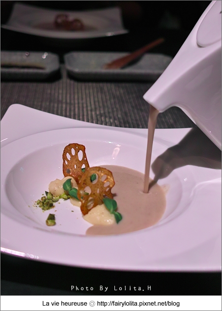 這道小品點綴的食材可真叫人大開眼界!干貝上放置了黑色魚子醬及白蝸牛卵,魚子醬是平常比較常見的食材,但那白蝸牛卵可就新鮮了,沒想到保養品的元素,竟然也可以變成調味食物的食材,干貝煎得外赤內軟,熟度也是恰到好處,而白蝸牛卵吃起來沒有任何腥味,只覺得它的口感Q嫩有彈性,相當特別!