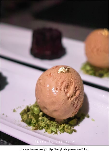 初入口是鮮明的焦糖香,其中蘊含著焦糖特有的苦調,當冰淇淋融化在嘴裡時,松露的菇蕈味則逐漸蔓延在舌尖上,添加海鹽更提升了焦糖的甜度與香氣,沒想到這兩種食材的組合,竟然可以交織出如此美妙的滋味,當服務小姐來詢問對今天餐菜的滿意度時,立馬對她們大力讚賞這道甜品,甚至一度讓我想問,這冰淇淋可以有另外販售嗎?!XD