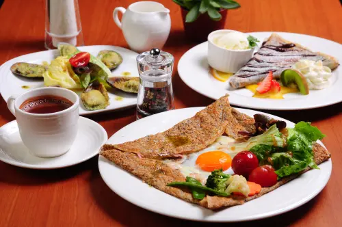 共有開胃前菜,鹹薄餅,甜味可麗餅與茶飲