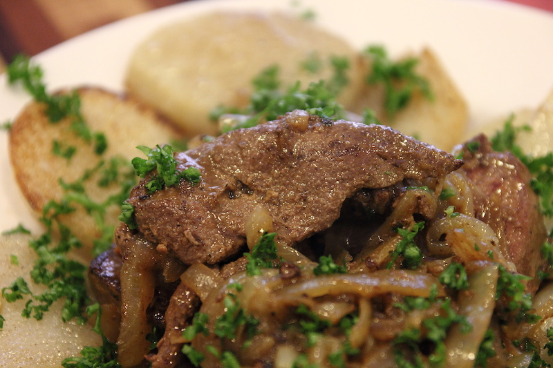 以前都覺得歐美不吃內臟,可去了一趟歐洲之後,在倫敦吃到豬血腸、羅馬吃到豬粉腸義大利麵後,才知道歐洲人也是吃內臟的,只是比較少。這次只點了份主菜,選了豬肝,法國人也吃豬肝,不過好像都做成豬肝醬來吃,不知道葡萄牙人的豬肝是何作法?等了一會,開放式廚房傳來陣陣香味,令人好奇與期待。最後送上的主菜豬肝,則是洋蔥炒豬肝搭配煎馬鈴薯片,灑上大量荷蘭芹。