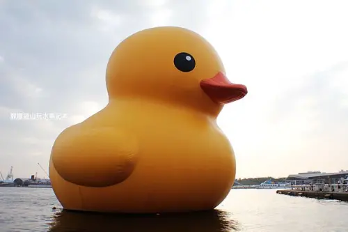 因為這天中午發布海上颱風警報,阿揪到光榮碼頭時黃色小鴨已經游回岸邊準備消氣休息。