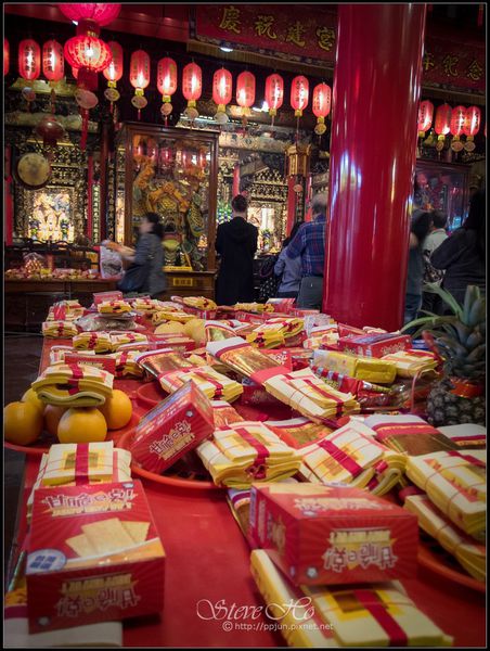 ▼鄰近有饒河街夜市、松山車站,人潮絡繹不絕,香火鼎盛。當時正值過年期間,貢桌上擺滿了各式紙錢和貢品