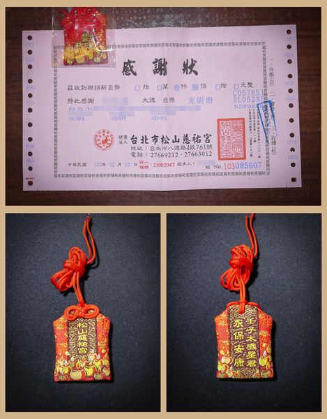 ▼今年皮皮君一家3口全都犯太歲(那麼巧?!),所以除了例行的迎財神、點光明燈外,今年還要加個安太歲