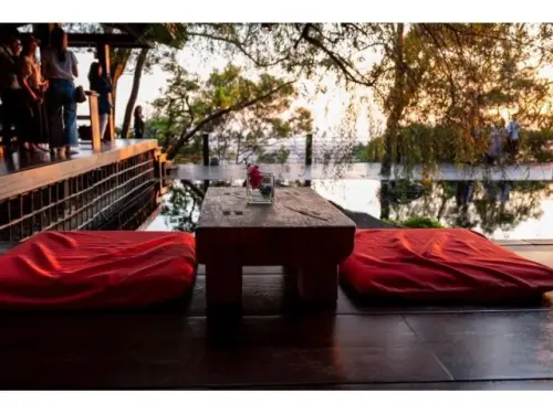 舒適的榻榻米地板 上面擺著深色的木頭桌子及大紅色的座椅