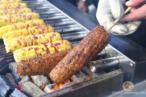 熟透的玉米串上竹籤,一一插在爐台上翻轉著,讓相思木的炭火把玉米煙燻上味,再把玉米塗上第一層的蒜蓉醬,等漸漸收乾後上第二道甜辣醬,直到最後一層沙茶醬才完成,如果你要加辣要另外提醒,或者不要太大支要先講,不然等到上秤重台就決定生死了。