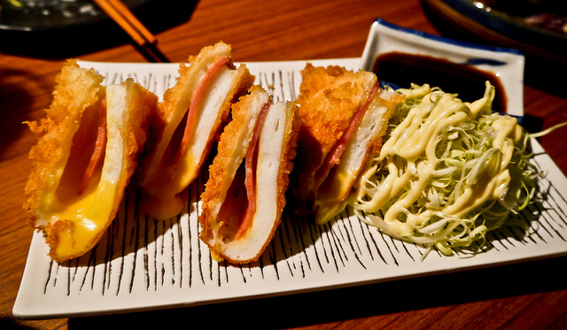 這不是炸土司。而是把魚糕加上起司與火腿配上炸粉酥炸過