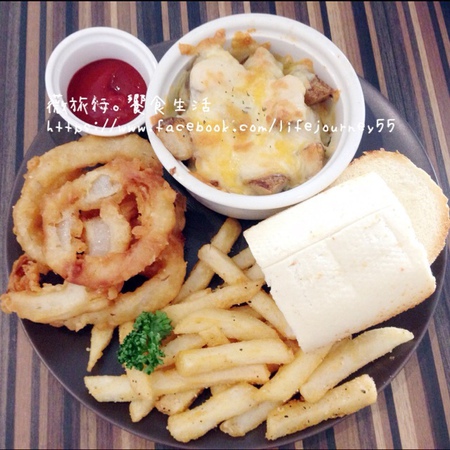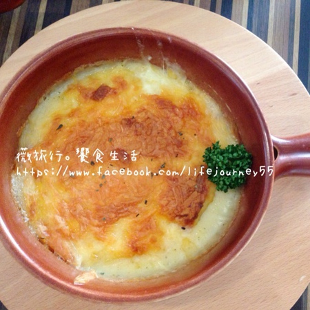 艾薇滿喜歡長棍麵包的口感,烤得熱呼呼帶點微硬的麵包搭著焗洋芋野菇味道也算不錯