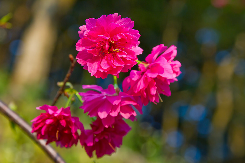 花朵為多花瓣的櫻花,形狀如吊鐘狀、顏色紅、花柄長