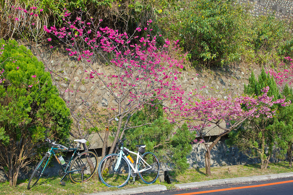 連騎單車的車友,也被這盛開的櫻花所吸引