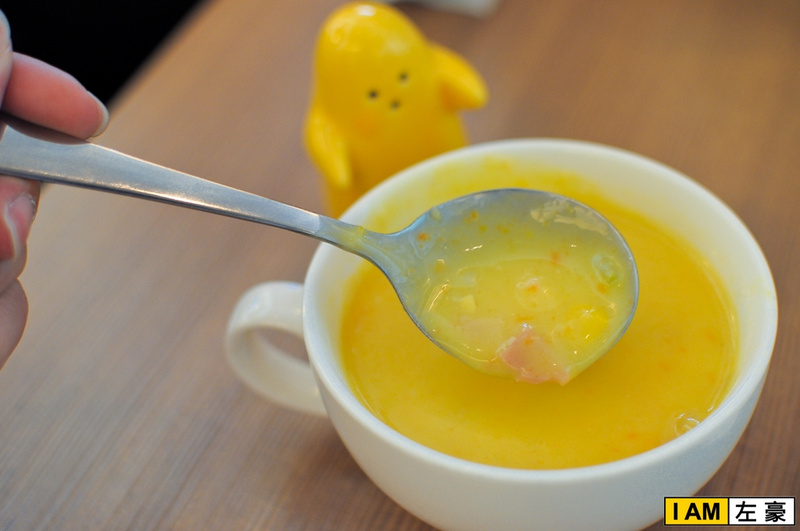 有著洋蔥、芹菜、玉米、火腿組的玉米濃湯嚐起來