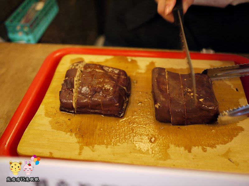 接著店員開始處理蒜香烏龍豆干,是一整塊下去切的。